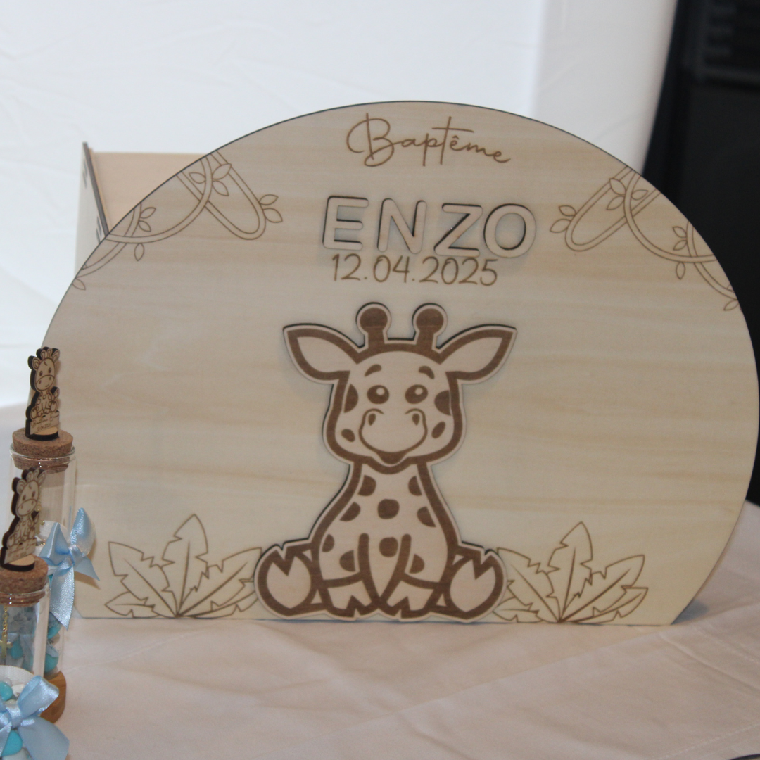 Apportez une touche de nature et d’aventure à votre événement avec notre urne en bois au thème jungle, à la forme arrondie unique. Parfaite pour un baptême, un anniversaire, ou même pour une célébration de mariage ou tout autre événement spécial, cette urne ajoutera une note chaleureuse et originale à votre décoration.